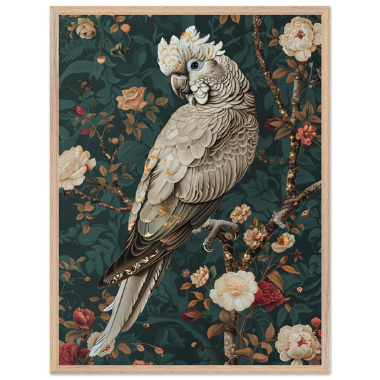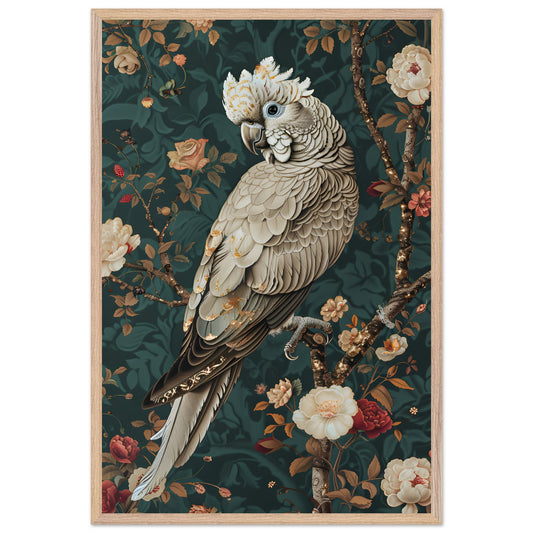 Golden Cockatoo in Floral Elegance. Premium Wooden Framed Poster With Premium Semi-Glossy Paper