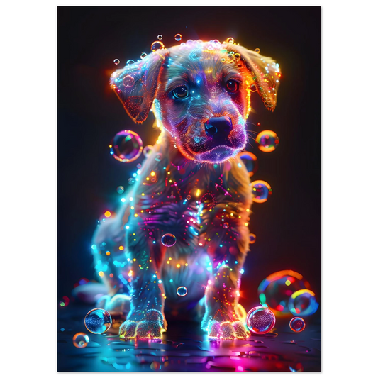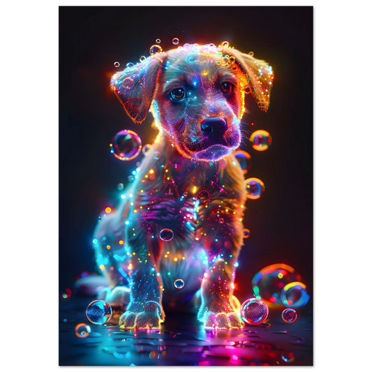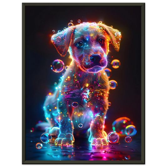 Starlit Puppy – Neon Glow Fantasy. Premium Semi-Glossy Paper Metal Framed Poster