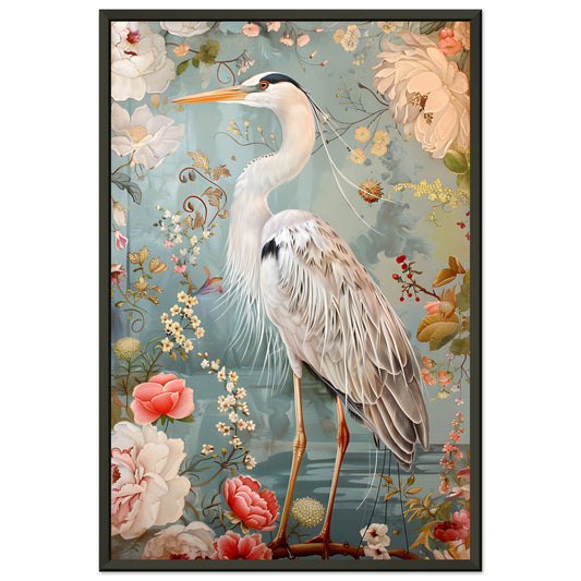 Graceful Heron in a Floral Dream. Premium Wooden Framed Poster With Premium Matte Paper