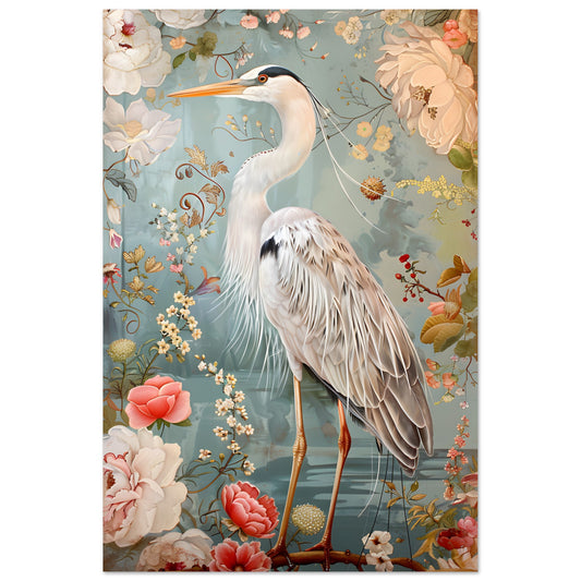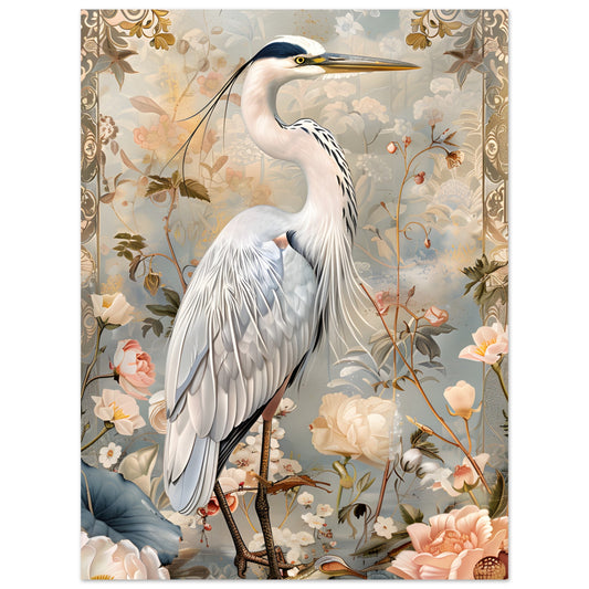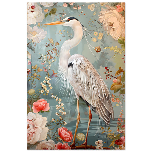 Graceful Heron in a Floral Dream. Premium Matte Paper Poster
