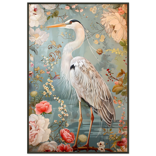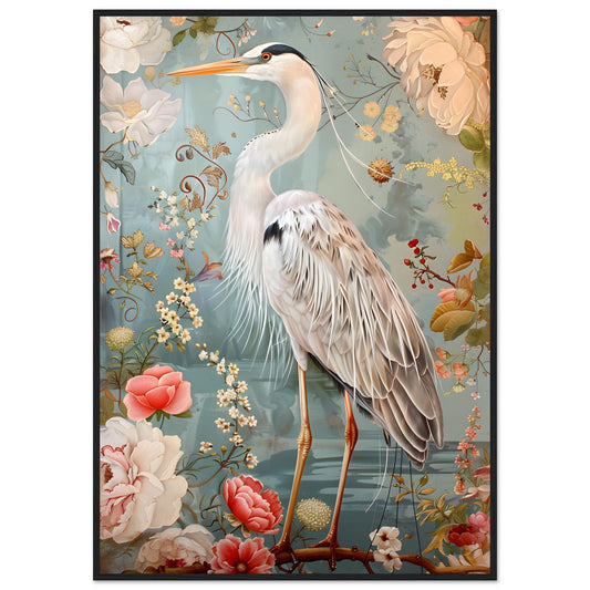 Graceful Heron in a Floral Dream. Premium Semi-Glossy Paper Metal Framed Poster
