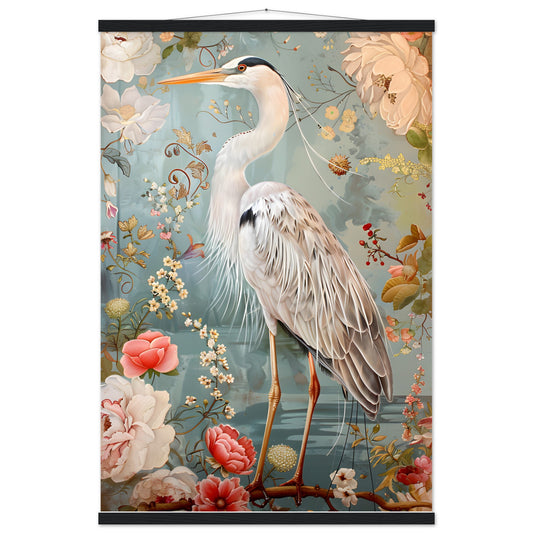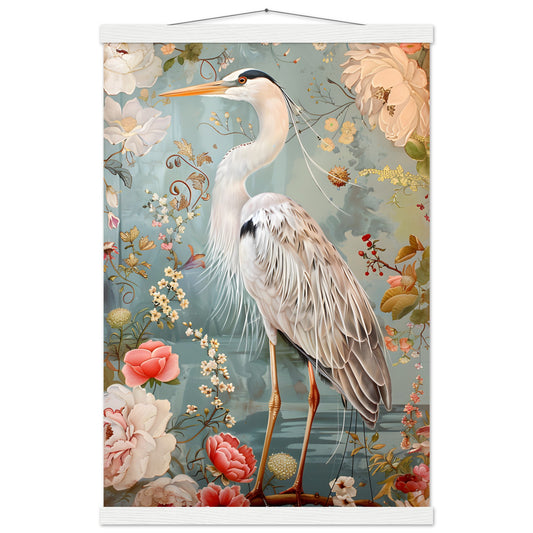 Graceful Heron in a Floral Dream. Premium Semi-Glossy Paper Poster with Hanger