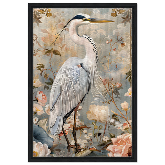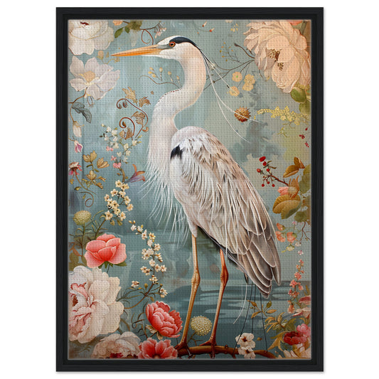 Graceful Heron in a Floral Dream. Framed Canvas