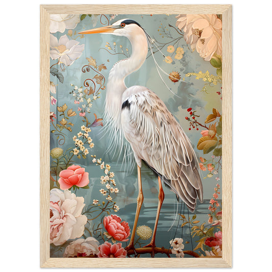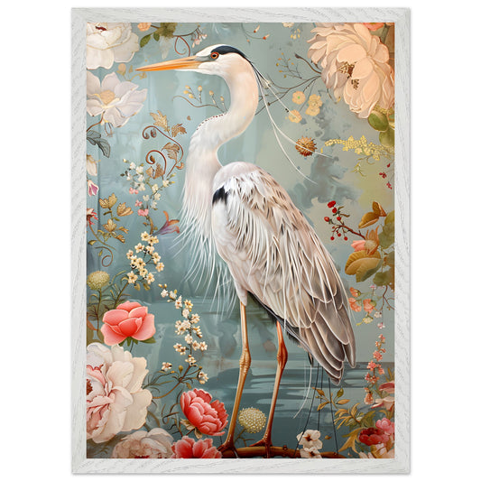 Graceful Heron in a Floral Dream. Premium Wooden Framed Poster With Premium Semi-Glossy Paper