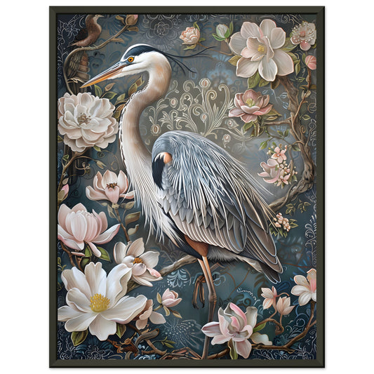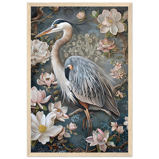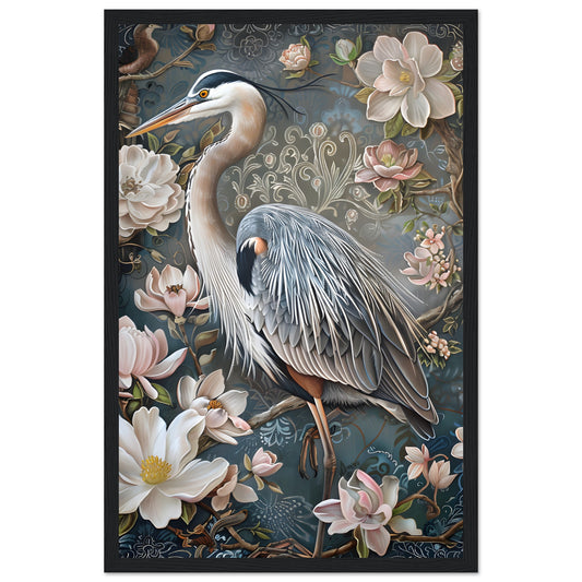 Graceful Heron in Blooming Harmony. Premium Matte Paper Wooden Framed Poster
