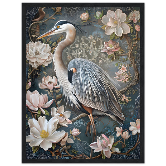 Graceful Heron in Blooming Harmony. Premium Matte Paper Wooden Framed Poster - Premium Semi-Glossy Paper Poster