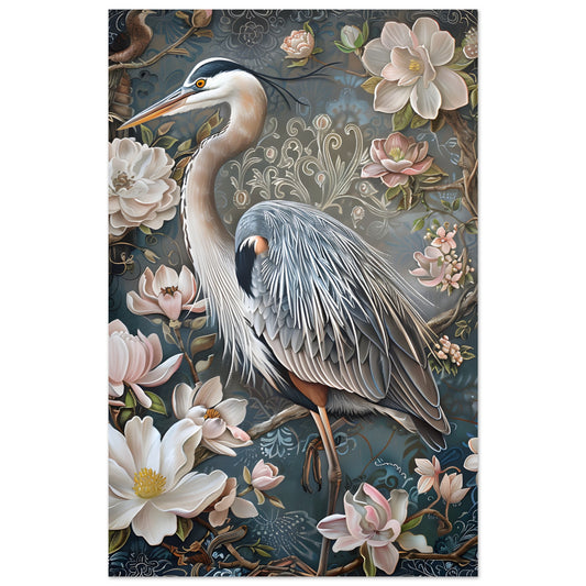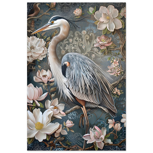 Graceful Heron in Blooming Harmony. Premium Semi-Glossy Paper Poster