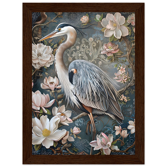 Graceful Heron in Blooming Harmony. Premium Wooden Framed Poster With Premium Semi-Glossy Paper