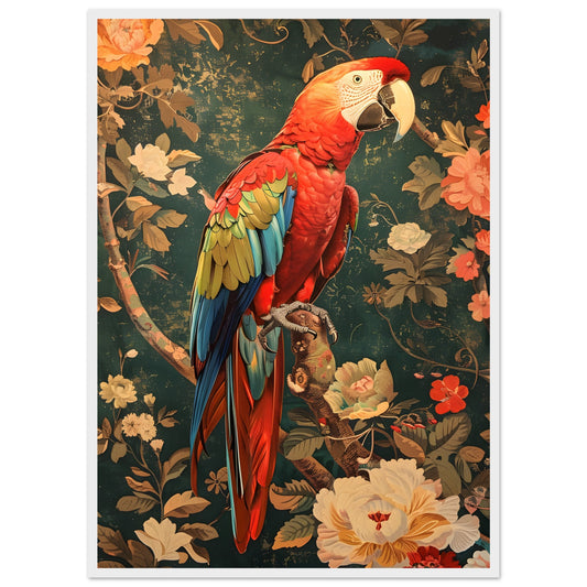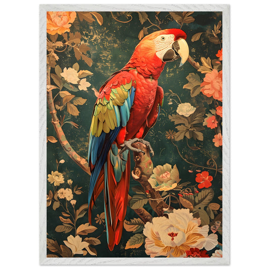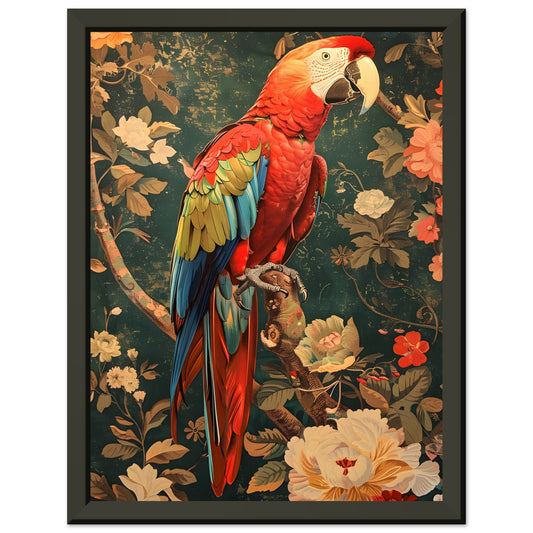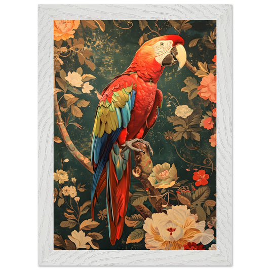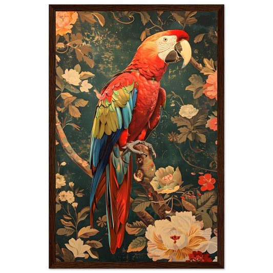 Majestic Scarlet Macaw in Floral Paradise. Premium Matte Paper Wooden Framed Poster