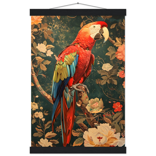 Majestic Scarlet Macaw in Floral Paradise. Premium Semi-Glossy Paper Poster with Hanger
