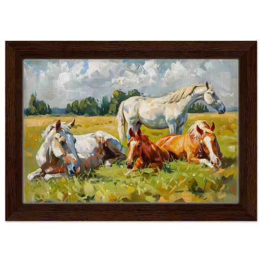 Pastoral Peace – Horses Resting in a Summer Meadow. Framed Canvas
