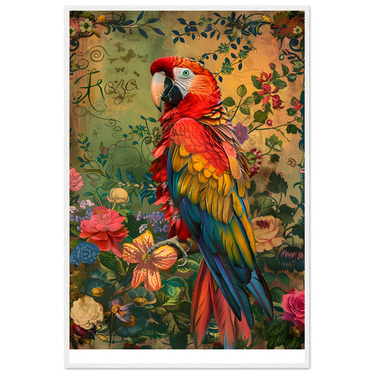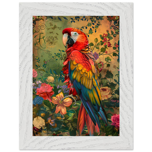 Premium Vibrant Ara in Floral Harmony. Wooden Framed Poster With Premium Semi-Glossy Paper