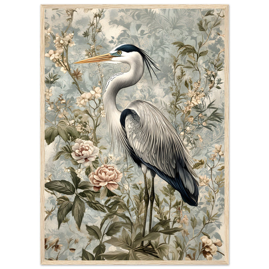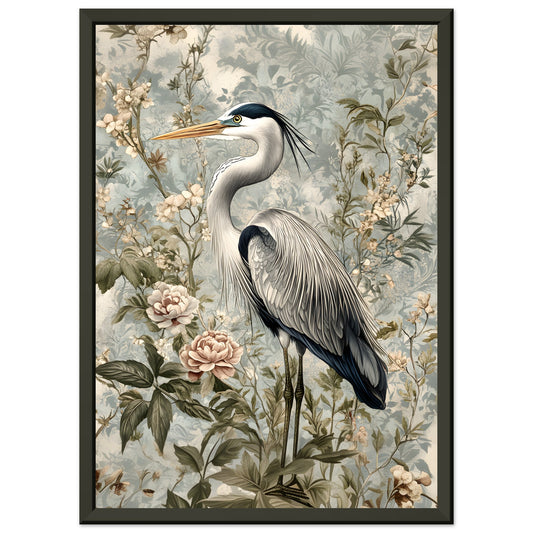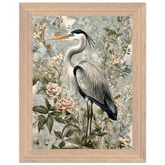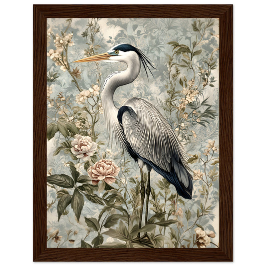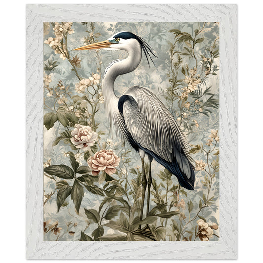 Timeless Elegance: Heron Among Blossoms. Premium Matte Paper Wooden Framed Poster