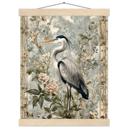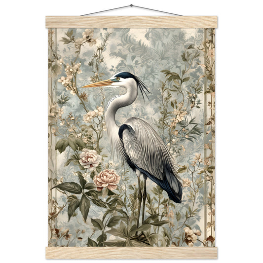 Timeless Elegance: Heron Among Blossoms. Premium Semi-Glossy Paper Poster with Hanger
