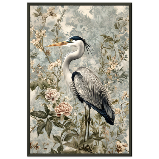 Timeless Elegance: Heron Among Blossoms. Premium Semi-Glossy Paper Metal Framed Poster