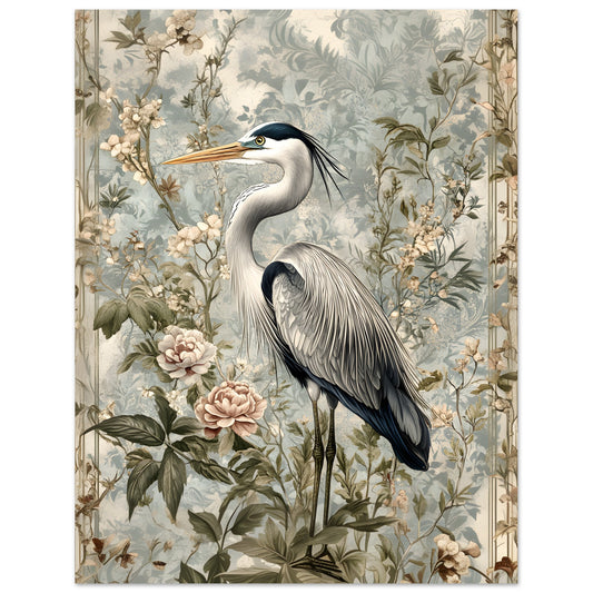 Timeless Elegance: Heron Among Blossoms. Premium Matte Paper Poster