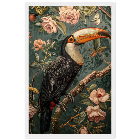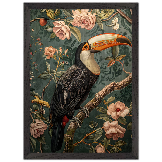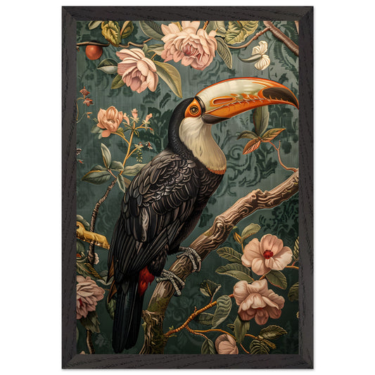 Elegant Toucan in Floral Harmony. Premium Matte Paper Wooden Framed Poster