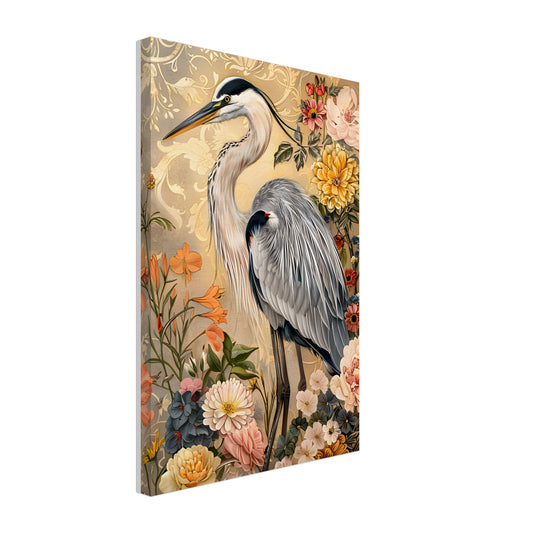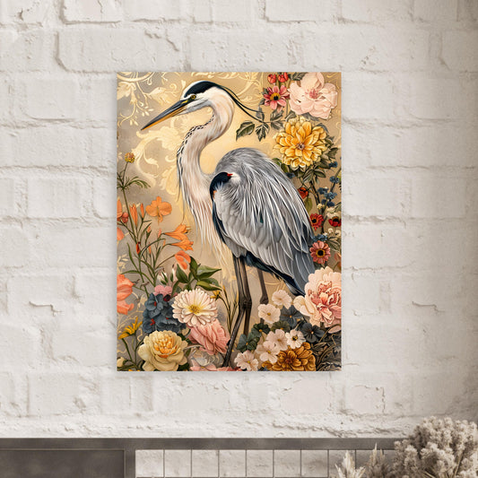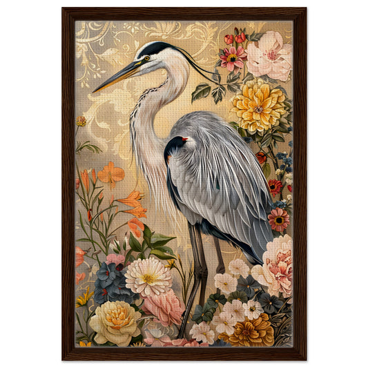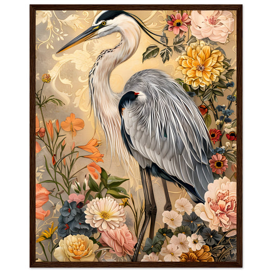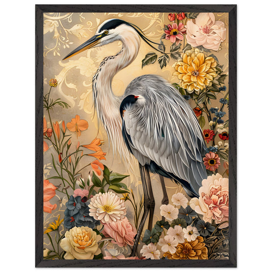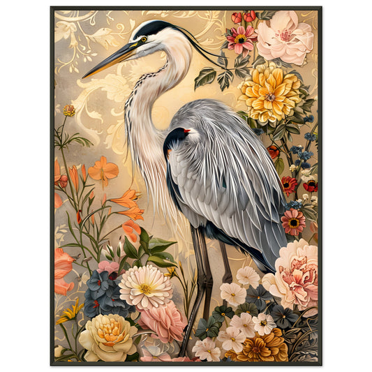 Elegant Heron in Blooming Harmony. Premium Matte Paper Poster - Framed Canvas