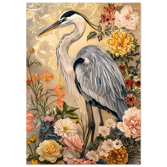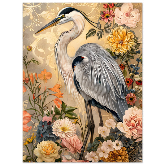 Elegant Heron in Blooming Harmony. Premium Matte Paper Poster