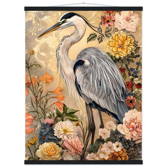 Elegant Heron in Blooming Harmony - Premium Matte Paper Poster with Hanger
